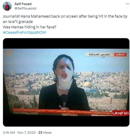 Newschecker first ran a keyword search for “Hana Mahameed Israel attack”, which led us to this The Guardian news report, dated October 5, 2015, stating that Arab-Israeli TV journalist Hanna Mahameed went on air shortly after being hit in the face by a stun grenade during a clash between Israeli police and Palestinian protesters in east Jerusalem. “Mahameed, who works for Lebanese-based Al-Mayadeen TV, was allegedly hit by a projectile grenade fired by Israeli police… She later appeared on air with much of her face covered in bandages,” read the report.