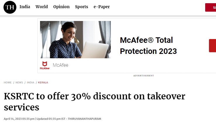 A keyword search for “KSRTC 30%”, led us to this The Hindu report, dated April 14, 2023, stating that KSRTC has announced a 30% fare discount for passengers on the newly launched takeover services.