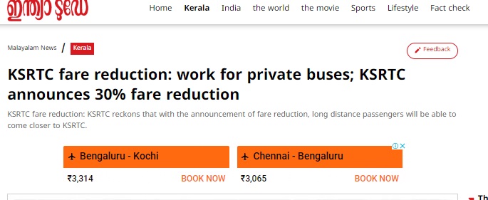 “There were complaints that private buses were conducting unauthorised services violating rules and without following any approved ticket rate. These services are conducted just ahead of the KSRTC services and cause heavy losses to the corporation. Following this, the KSRTC recently started 223 takeover services as per the direction of the state government on routes above 140km in order to benefit passengers. The corporation would offer a 30% discount on ticket fare on these routes to attract passengers, said a release issued by the Corporation,” read the article. Similar reports can be seen here and here.