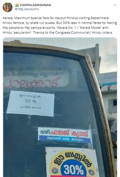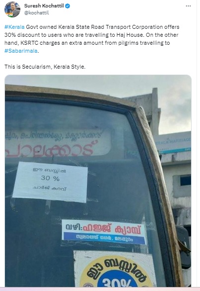 Several social media users are sharing a photo of a KSRTC bus in Kerala, claiming that there is a 30% discount on bus fare for Hajj pilgrims. “Govt-owned Kerala State Road Transport Corporation offers a 30% discount to users who are travelling to Hajj House. On the other hand, KSRTC charges an extra amount from pilgrims travelling to #Sabarimala. This is Secularism, Kerala Style,” read a post.