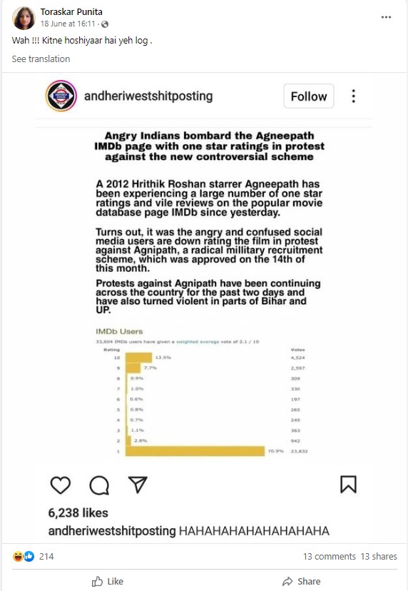 The post claims that the Hrithik Roshan starrer has been receiving one star rating on IMDb as “the angry and confused social media users are down rating the film in protest against Agnipath.” Those who shared the image and interacted with the such posts lashed out, mocked and took a jibe at such protesters.