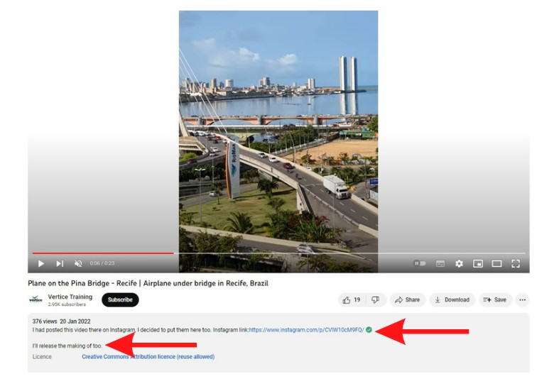 Following this, we conducted a Google reverse image search on the keyframes of viral footage along with the keywords “Recife,” & “aeroplane under bridge.” This led us to a YouTube video by Vertice Treinamentos, dated January 20, 2022, displaying a slightly longer version of the widely circulated clip.