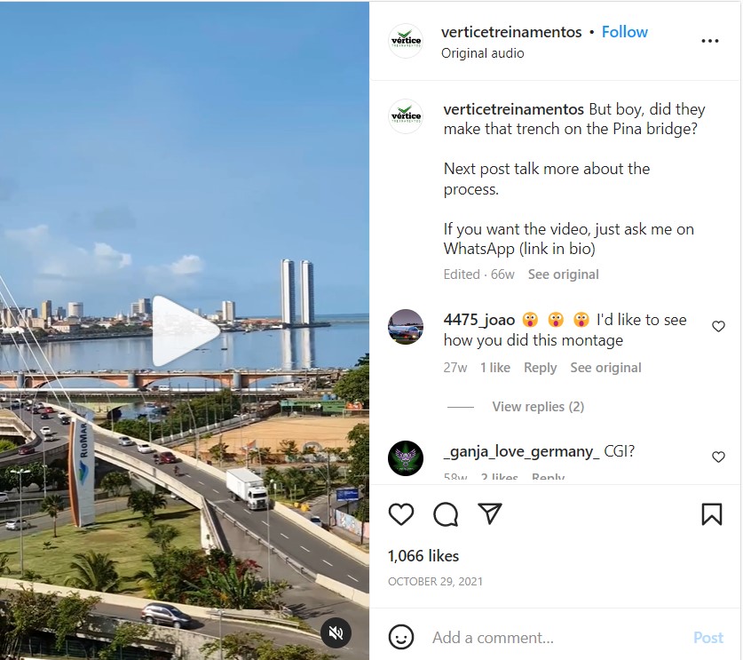 On scanning through the comment section of the post, we spotted some replies by Vertice Treinamentos suggesting that the video has been digitally edited. One such response read, “It’s an editing from a footage that I made on the 7th floor. You can check my next post to see the wireframe and render before insert on original vídeo. (translate from Portuguese)”
