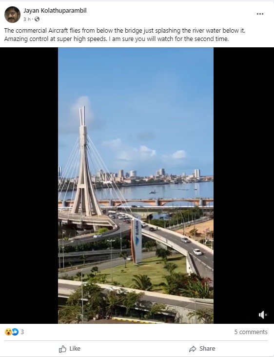 A video of an aircraft flying under the bridges before heading up in the sky is doing the rounds on social media platforms. Several users who shared the video claimed, with amazement, that it shows an actual incident.
