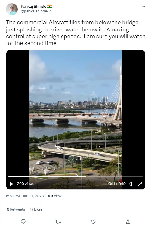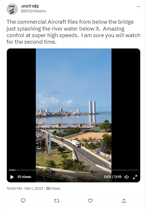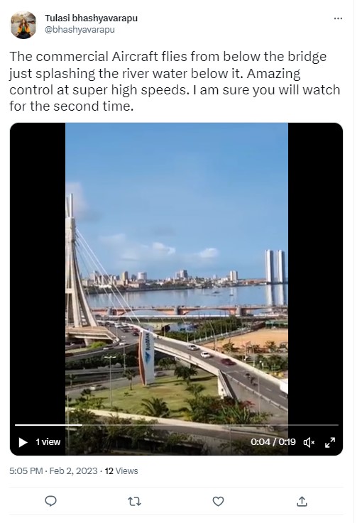 Several Twitter users shared the video with the caption, “The commercial Aircraft flies from below the bridge just splashing the river water below it. Amazing control at super high speeds. I am sure you will watch for the second time. (sic)”