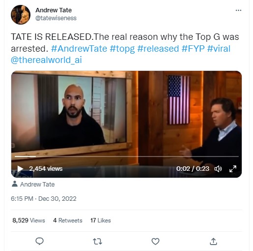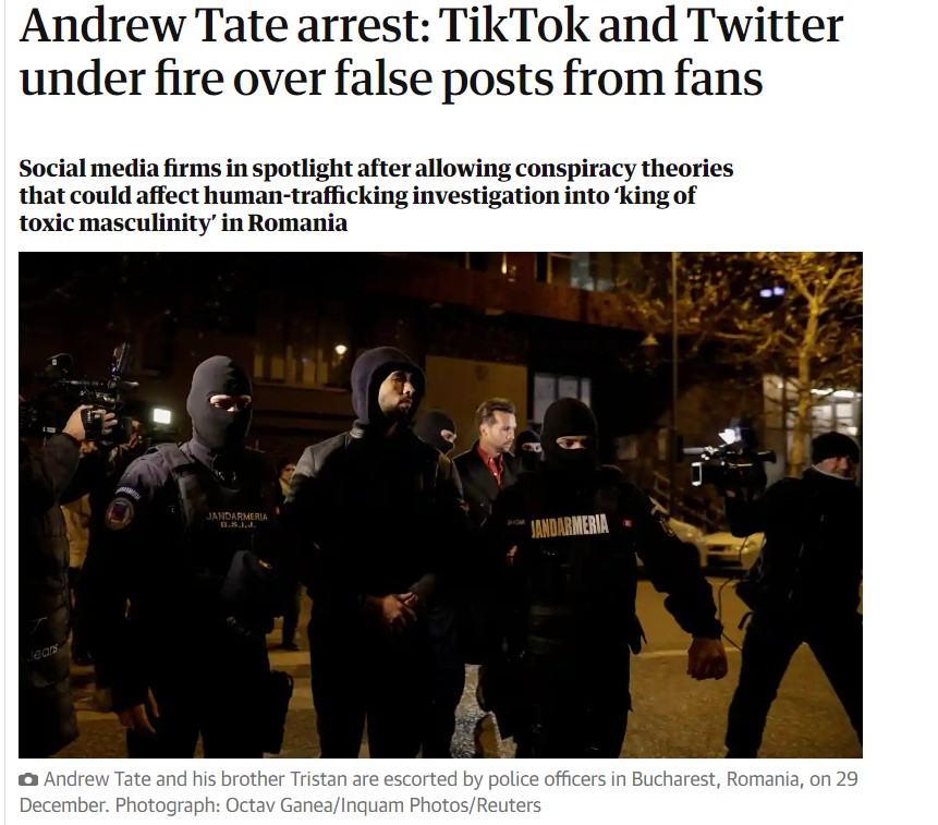 On December 30, 2022, BBC had reported, “The controversial British-American influencer Andrew Tate will be held in detention in Romania for 30 days, after a court agreed to a police request.”