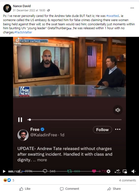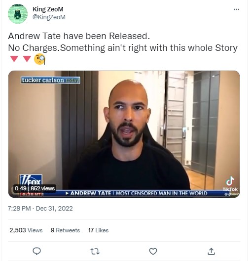 Former kickboxer turned “misogynist” social media personality Andrew Tate and his brother Tristan were arrested last week in Romania on suspicion of human trafficking and rape. Soon after, social media platforms went rife with video purportedly showing Tate “after his release” in Romania “without any charges.” One such footage of Tate’s interview with Fox News’ Tucker Carlson is going viral on social media with a claim that the former has been freed. Newschecker found the claim to be false.