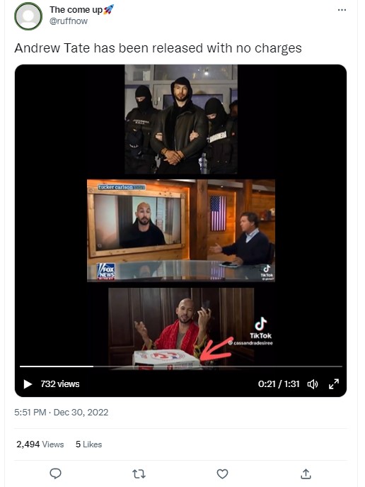 Viral claim that Andrew Tate has been released by the Romanian authorities following his arrest last week is false. Tate is still in detention, by the time of publishing this article. Additionally, the viral footage of his interview with Fox News dates back to August, 2022.