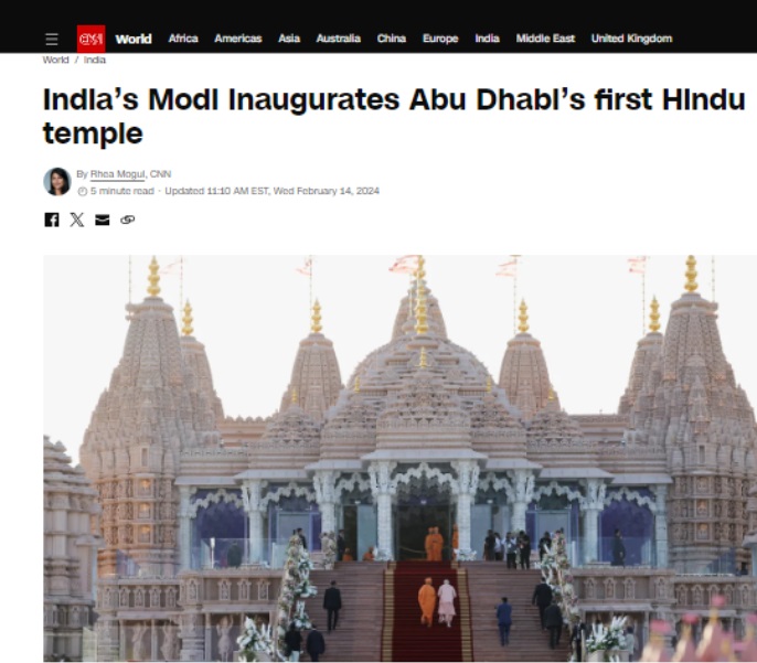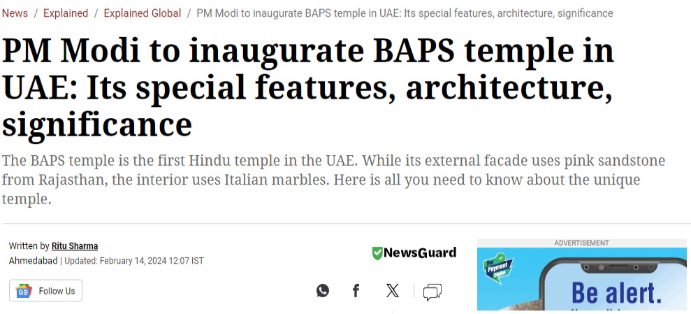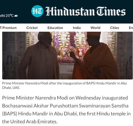 We came across this report from UAE-based Khaleej Times, dated February 14, 2024, about the BAPS mandir, stating that it is the only Hindu temple in Abu Dhabi, but also the Middle East’s first traditional Hindu stone temple.