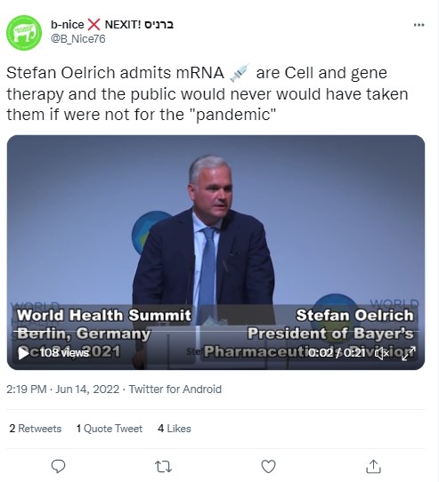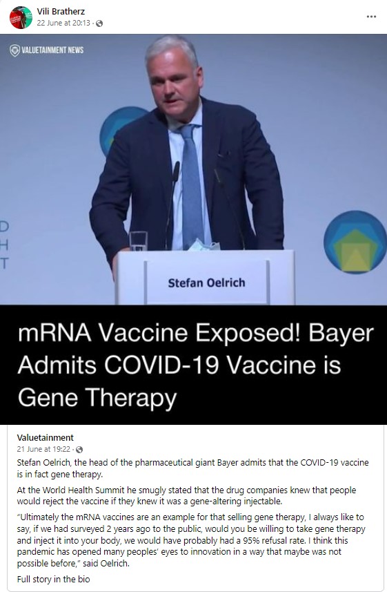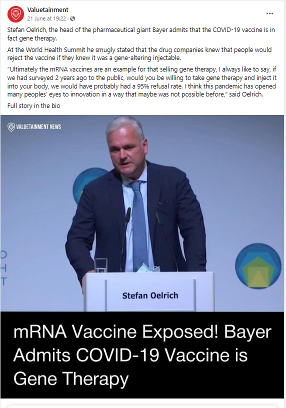 Thus we could conclude that a clip from his address has been extracted to mislead people into believing that Oelrich’s “admitted” about mRNA vaccine being gene therapy.