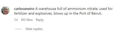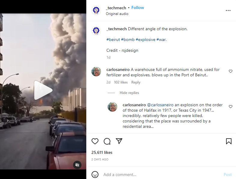 Upon going through the comments section, we noticed that a few users had commented saying that the explosion was from two years ago when a warehouse full of ammonium nitrate blew up in Beirut after catching fire.