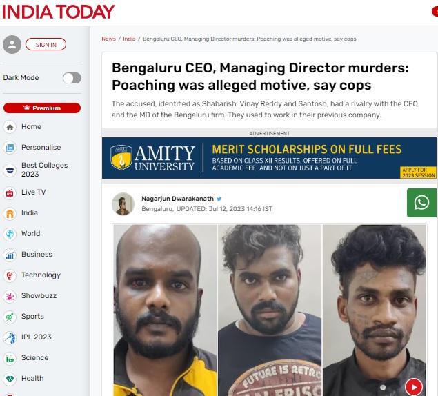 “According to police, the accused had a rivalry with the CEO and the MD of the Bengaluru firm. They used to work in their previous company, police earlier told India Today. They had resigned from their previous company, and formed their own firm. They allegedly poached employees and customers, sources said,” read an India Today report, dated July 12, 2023.