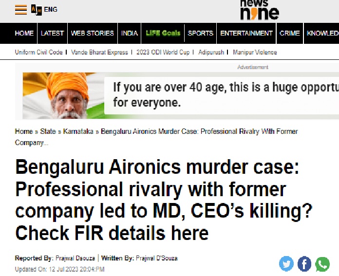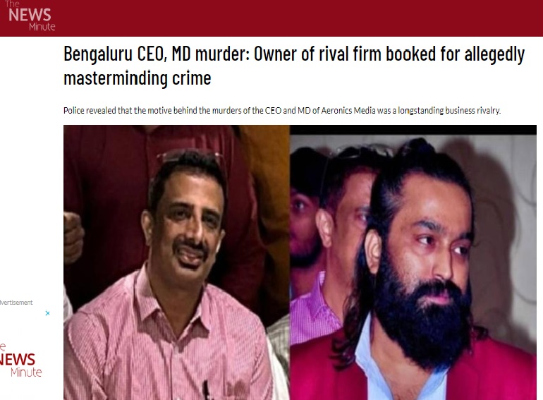 “Bengaluru police have registered a First Information Report (FIR) against Arun Kumar Azad, the owner of internet service provider (ISP) firm GNet, in connection with the double murder of the CEO and MD of Aeronics Media Private Limited on Tuesday, July 11. The victims were Vinu Kumar, the CEO, and Phanindra Subramanya, the MD of the tech firm. The complaint filed by a staff member of Aeronics indicated that the killings were driven by business rivalry,” read a The News Minute article, dated July 13, 2023, stating that DCP Laxmi Prasad revealed that the motive behind the murders was a longstanding rivalry linked to the victims’ previous association with Arun.