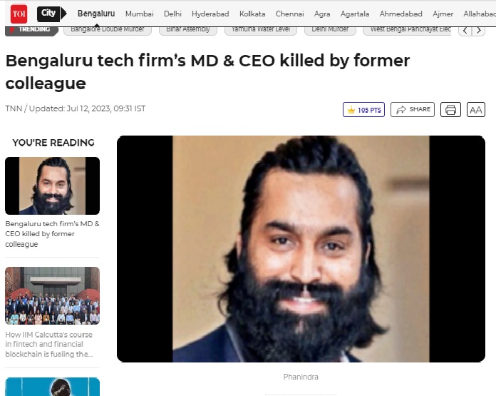 “The managing director (MD) and the chief executive officer (CEO) of a newly established company providing broadband internet services were murdered in their office, allegedly by three men, in Amrutahalli, off Ballari Road, in Bengaluru on Tuesday. Police suspect business rivalry as the motive behind the murder,” read a Times of India report, dated July 12, 2023, quoting DCP (North East) Laxmi Prasad, who said, “Phanindra Subramanyam, 36, and Vinu Kumar, 40, MD and CEO, respectively, of Aironics Media Private Limited, were hacked to death by a former colleague and his two associates inside their office.”