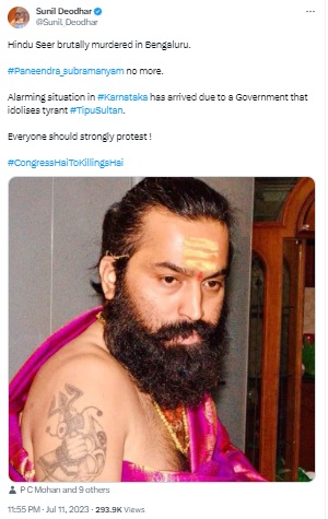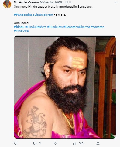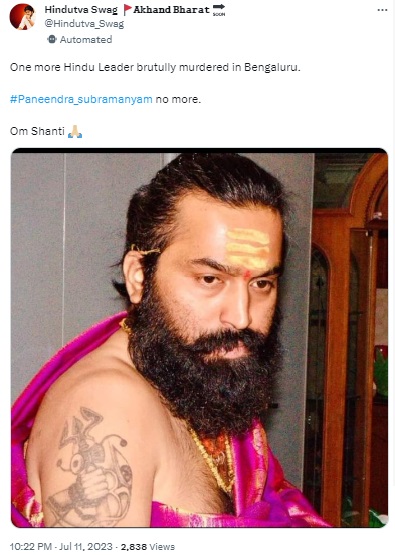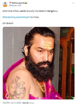 Several social media users are sharing a purported photo of Phanindra Subramanyam, the MD of Aironics Media Private Limited, who was brutally murdered along with his CEO in Bengaluru, with the claim that one more Hindu seer and leader was killed in the state.