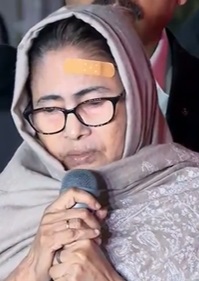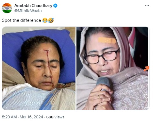 However, several social media users are circulating two images, one of which shows the All India Trinamool Congress chairperson with a deep cut in the middle of her forehead, while the other purportedly shows Banerjee delivering a speech after her discharge, with a band-aid slightly away (on the left side of her head, above the eyebrow) from the wound. The users, through the photos, insinuate that the West Bengal CM faked her injury and that the ”fall” was merely a publicity stunt ahead of the upcoming Lok Sabha elections.