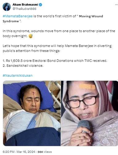 Nerwschecker found that the All India Trinamool Congress had tweeted out photos of Banerjee’s injury, with the bleeding wound clearly seen on the middle of her forehead, on March 14, 2024.
