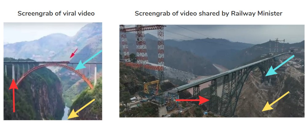 On comparing the keyframes of the viral footage with the visuals of Chenab bridge shared by Railway Minister Ashwini Vaishnaw on his Twitter handle on March 26, 2023, we found certain discrepancies. Firstly, the colour of the metal arch supporting the bridges is different. While the arch seen in the viral clip is rust/orange in colour, the one in visuals shared by Vaishnaw is green/black. Additionally, we did not spot the stream of water under the bridge in the video posted by the Railway Minister, however a river is seen passing under it in the viral clip.