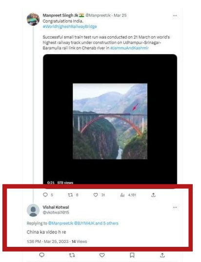 We could thus conclude that a video of a train passing through a bridge in China has been falsely shared to show the Indian government’s ambitious railway bridge over the Chenab River in Jammu & Kashmir.