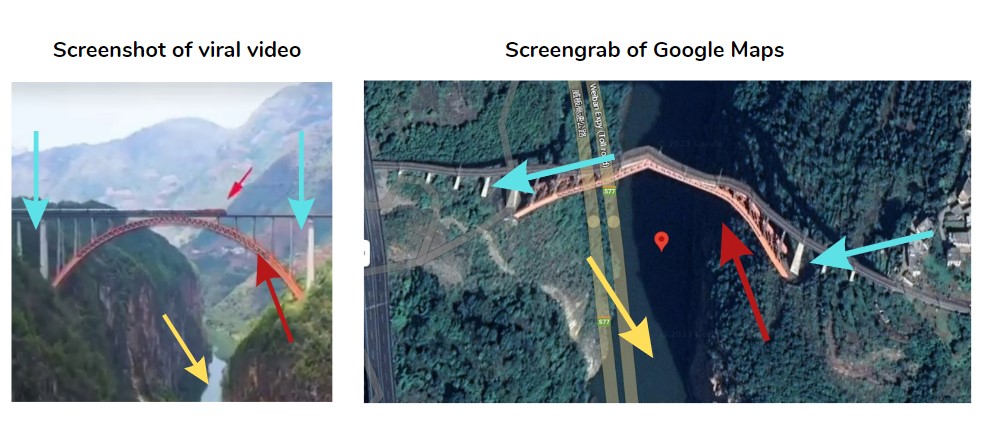 Taking a clue, we looked up “China,” “Railway Arch Bridge,” & “River” on Google which led us to a website called Highest Bridges. It carried images of a bridge identical to the one seen in the viral footage, and identified it as the Beipanjiang Railway Bridge Shuibai of China.