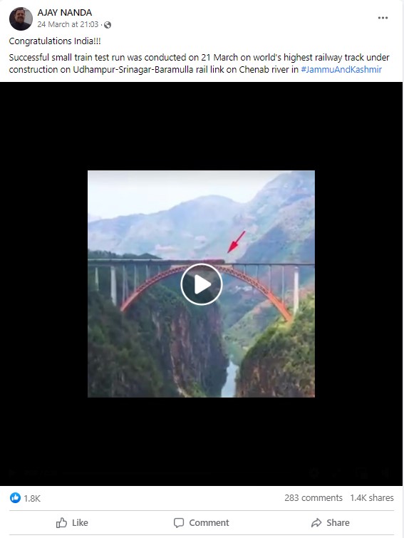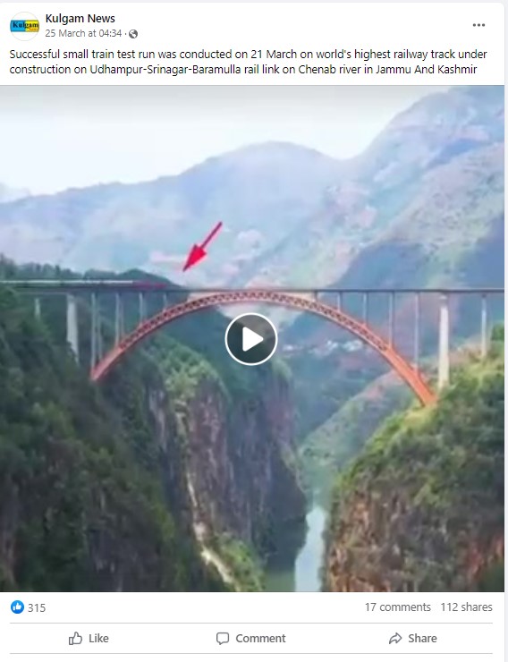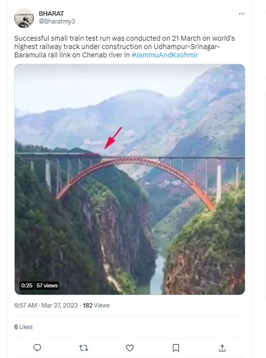 A video of a train passing through a bridge constructed over a valley is going viral on social media platforms. Several Twitter and Facebook users shared the viral clip with the caption, “a successful small train test run of the world’s highest railway track under construction on Udhampur-Srinagar-Baramulla rail link on Chenab river,” or the Chenab bridge in Jammu and Kashmir. Newschecker found that the video is being shared in a false context.