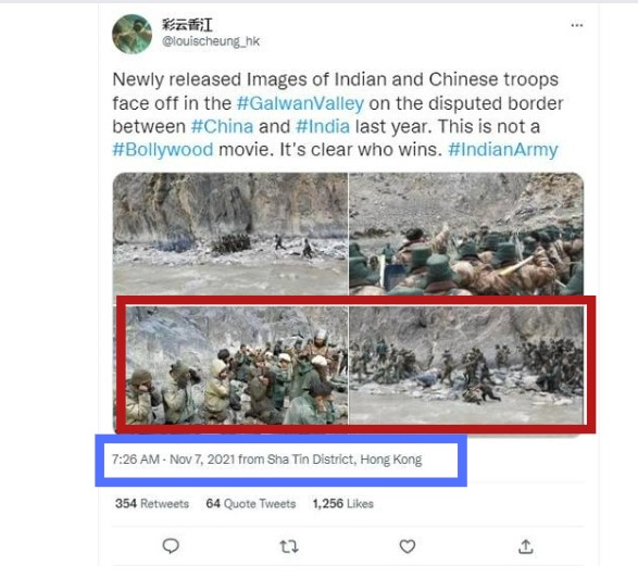 A Google reverse image search on the photograph allegedly showing Indian troops on their knees led us to a tweet by @louischeung_hk, dated November 7, 2021. The Twitter user had shared a set of four photographs, claiming to show “Newly released Images of Indian and Chinese troops face off in the #GalwanValley on the disputed border between #China and #India last year. This is not a #Bollywood movie. It’s clear who wins. #IndianArmy (sic)”