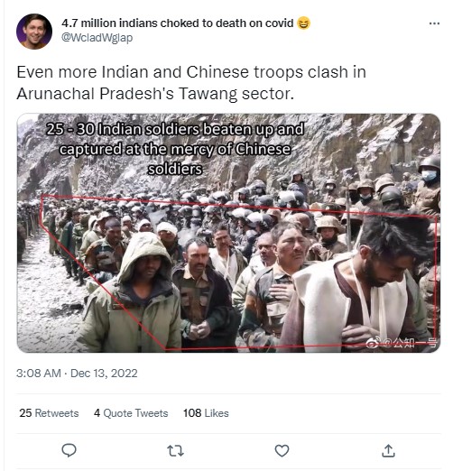 Ever since the Indian Defence Minister announced that the December 9 attempt by the PLA to “transgress the LAC in Yangtse area of Tawang Sector and unilaterally change the status quo”, several social media users have been pouring in praises for the Indian army, and celebrating their “valour” and “courage.” Many users also shared images claiming to show Indian soldiers “captured” by the Chinese troops in Tawang.