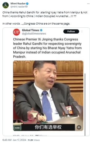 Newschecker saw that the tweets attached a purported screenshot of a tweet from China’s national English language newspaper, Global Times, appeared to be posted on January 14, 2024, which states, “Chinese Premier Xi Jinping thanks Congress leader Rahul Gandhi for respecting sovereignty of China by starting his Bharat Nyay Yatra from Manipur, instead of Indian-occupied Arunachal Pradesh”.