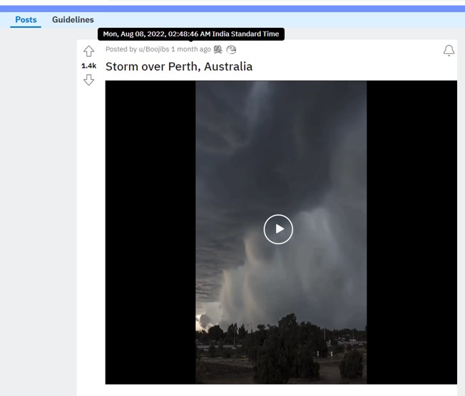 On carefully analysing the movement of vehicles seen in the video we could conclude that it is indeed a time-lapse footage. But does it show a cloudburst in Bengaluru? To answer the same, Newschecker conducted Google reverse image search on the keyframes of the viral video which led us to a Reddit post of August 8, 2022 carrying the same video. As per the Reddit post, the video is from Perth, Australia.