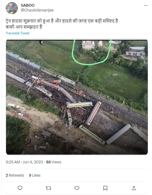 A day after the collision, Twitter user @Randomsena shared the viral image pointing out a building adjacent to the accident location with the caption, “Just Saying Yesterday Was Friday.” Thereby insinuating a particular community’s links to the accident. The tweet, which has since been deleted, was retweeted over 4,000 times. Multiple other social media users shared the image claiming that the three-way train accident took place near a mosque on a Friday.