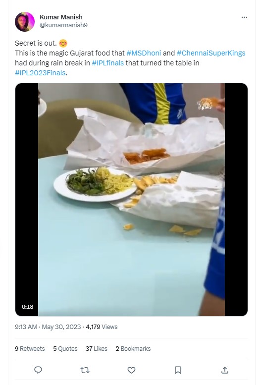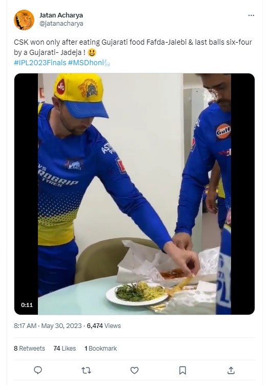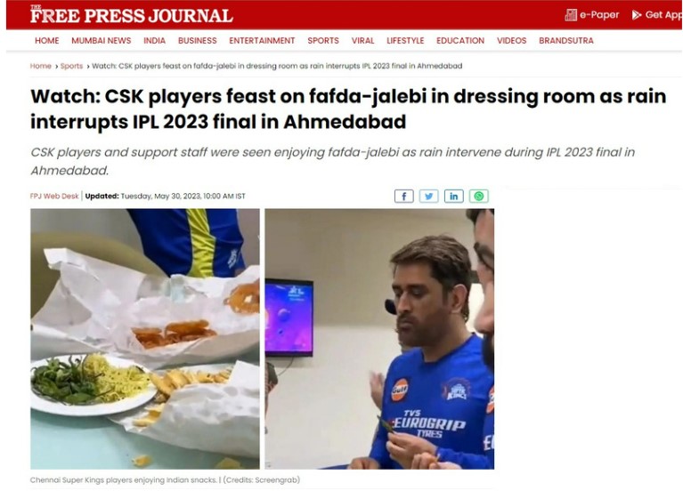 News outlet Free Press Journal also reported on the video, asserting, “Chennai Super Kings players were seen enjoying some delicious snacks during the rain-interrupted break of the IPL 2023 final on Monday at the Narendra Modi Stadium in Ahmedabad. The likes of MS Dhoni and Deepak Chahar were feasting on jalebi and fafda while waiting for the match to resume.”