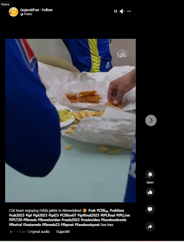 A keyword search for “CSK,” and “Fafda Jalebi” on YouTube led us to a video by ‘Cricket speak’ dated March 31, 2023. It carried a longer version of the viral footage, with the description saying, “Raining in Ahmedabad |Dhoni eating Jalebi fafda.” The YouTube channel had credited the video to “CSK ig.”
