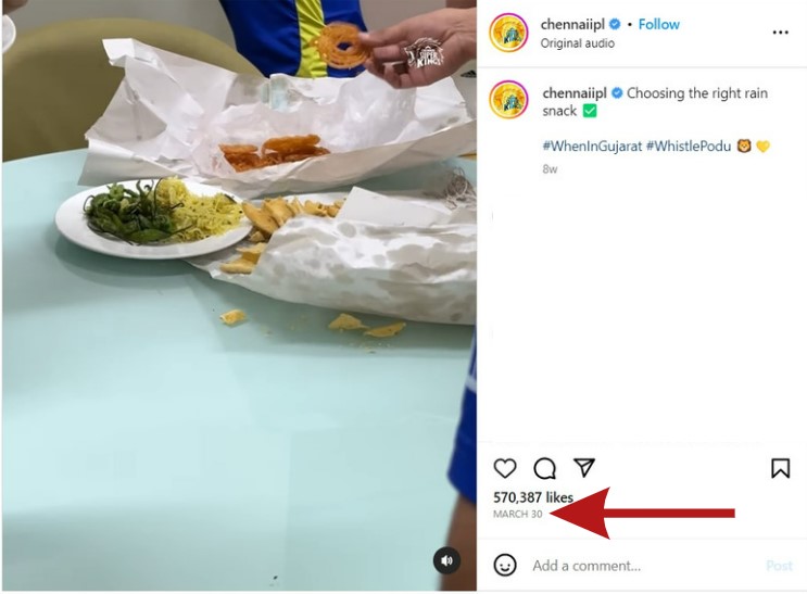 Following this, we skimmed through the Instagram handle of the Chennai Super Kings and found that a longer version of the viral footage was uploaded on the account on March 30, 2023. The caption accompanying the video read, “choosing the right rain snack ✅ #WhenInGujarat #WhistlePodu “
