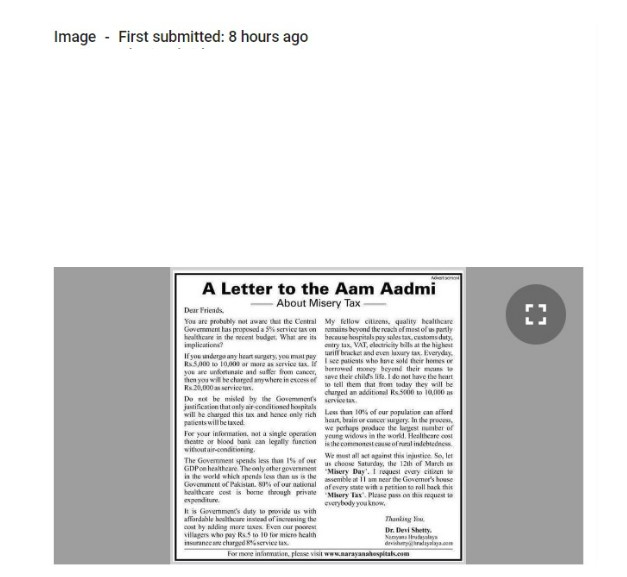 One such report published in Mid-Day, dated March 13, 2011, stated, “The healthcare industry continued to react strongly to the proposed service tax hike in the budget with Devi Shetty, one of the country’s renowned heart surgeons, writing an open letter calling the levy “unfortunate” and seeking observance of March 12 as ‘Misery Day’ to protest it. “