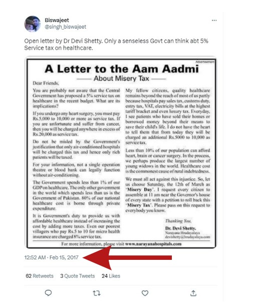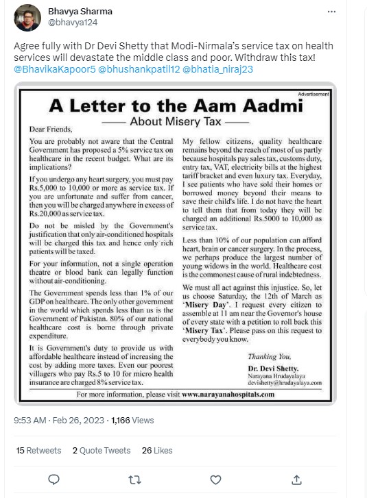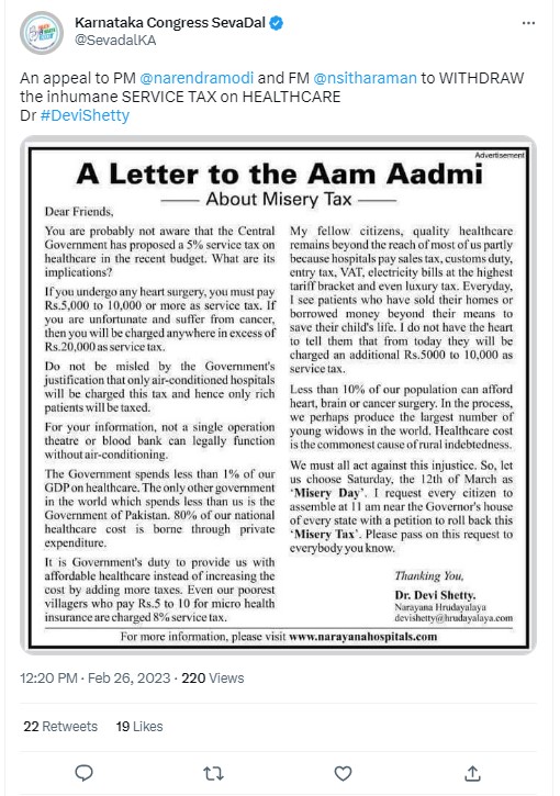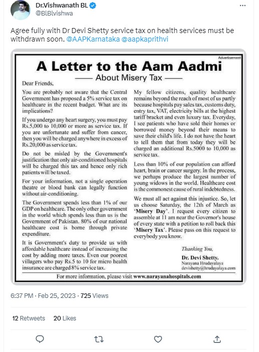 An open letter to the “Aam Aadmi” attributed to Dr Devi Shetty, founder of Narayana Health, informing about the proposal of “5% service tax on healthcare in the recent budget” is going viral on social media platforms. The letter further encourages the people to observe March 12 as “Misery Day,” and gather around Governors’ homes demanding a roll back of the proposed “Misery Tax.” Newschecker found that though the letter was written by Dr Shetty, it dates back to March 2011 and is being shared out of context.