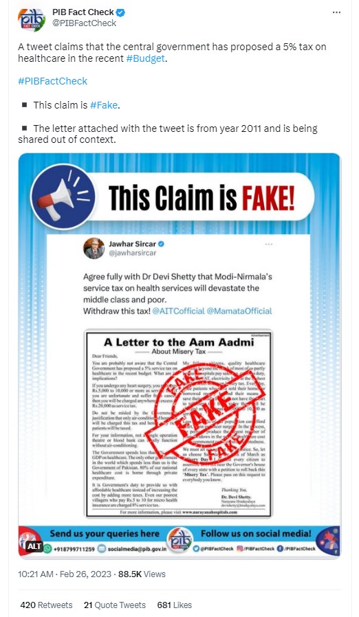 Further, in a tweet dated February 26, 2023, Government’s PIB Fact Check also clarified the viral open-letter by Devi Shetty is “from year 2011 and is being shared out of context.”