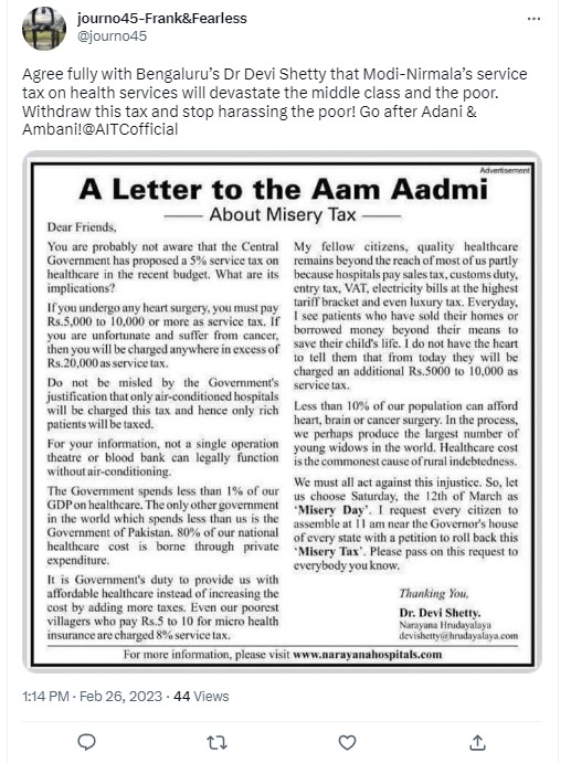 In a tweet, dated February 25, 2023, TMC leader Jawahar Sircar shared the viral image and stated, “Agree fully with Dr Devi Shetty that Modi-Nirmala’s service tax on health services will devastate the middle class and poor. Withdraw this tax!” The tweet has since been deleted. An archived version of the same can be seen here.