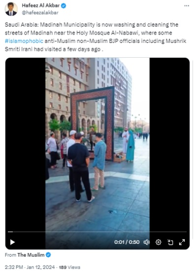 Several social media users, including verified accounts, are circulating a video, which claims that Saudi Arabia’s Madinah Municipality is washing and sanitising the streets of Madinah near the holy Masjid Al-Nabawi, because a “non-Muslim” delegation led by Indian Union minority affairs minister Smriti Irani had visited a few days ago.