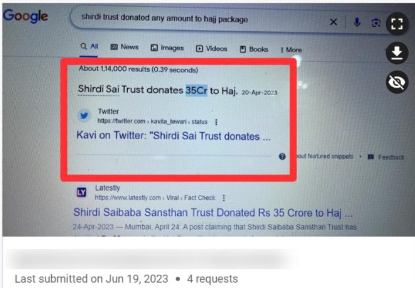An image of a Google search showing a tweet, dated April 20, 2023, which states that Shirdi Sai Trust has donated ₹35 Crore to the Haj committee has gone viral.