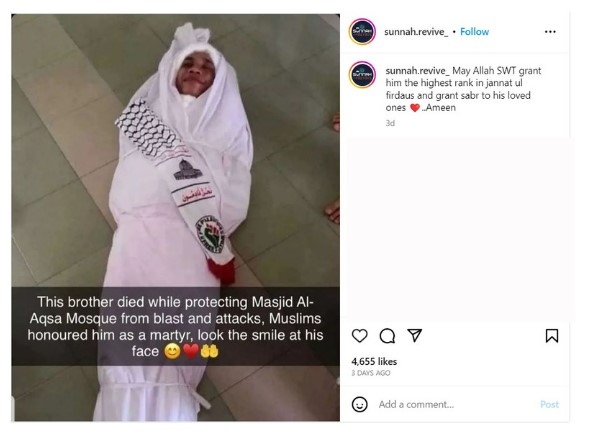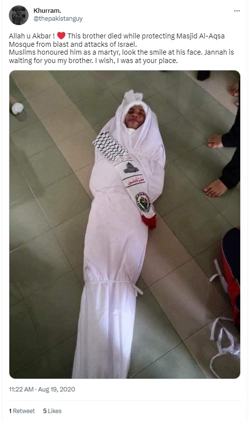 Several social media users shared the photograph claiming, “This brother died while protecting Masjid Al- Aqsa Mosque from blast and attacks, Muslims honoured him as a martyr, look the smile at his face. (sic)”