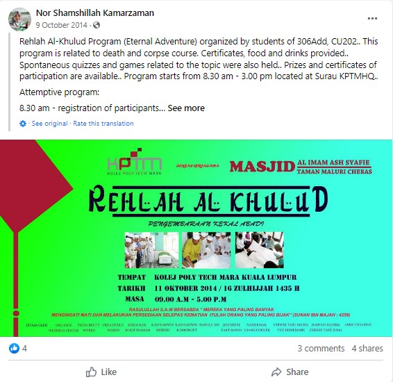 Kamarzaman, who identifies herself as a Senior lecturer at Kolej Poly-Tech Mara, stated, “Rehlah Al-Khulud Program (Eternal Adventure) organised by students of 306Add, CU202.. This program is related to the death and corpse course. Certificates, food and drinks provided… Program starts from 8.30 am – 3.00 pm located at Surau KPTMHQ. (translated from Malay with the help of Google.)”
