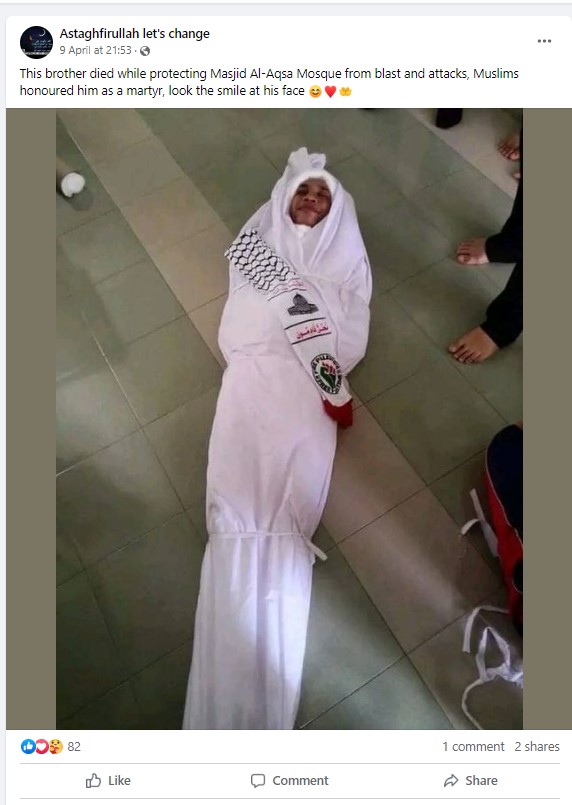 The alleged photograph of a “martyr” who “died smiling” while protecting the Al-Aqsa Mosque from the attack of Israeli forces has been in circulation for at least the past 3 years. We found several posts from 2020, sharing the image with the caption, “ This brother died while protecting Masjid Al-Aqsa Mosque from blast and attacks of Israel. Muslims honoured him as a martyr, look the smile at his face.. .(sic)”
