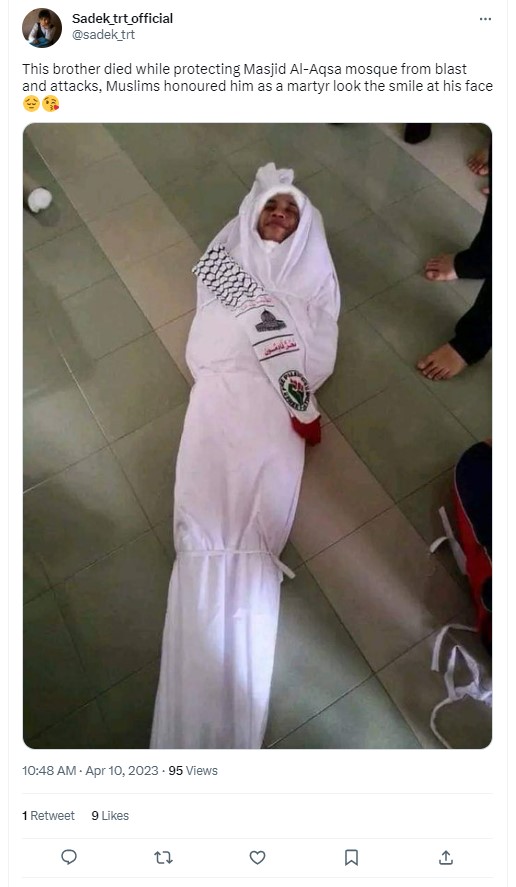 Hundreds of Palestinians were reportedly arrested following raids of the Israeli police on the Al Aqsa Mosque in Jerusalem last week. The situation in and around the city remained tense amid clashes. In this backdrop, a photograph of a boy shrouded in a white cloth who appears to be smiling is going viral on social media platforms. Those who shared the image claimed that it features a boy who was “martyred” while protecting the Al Aqsa Mosque.