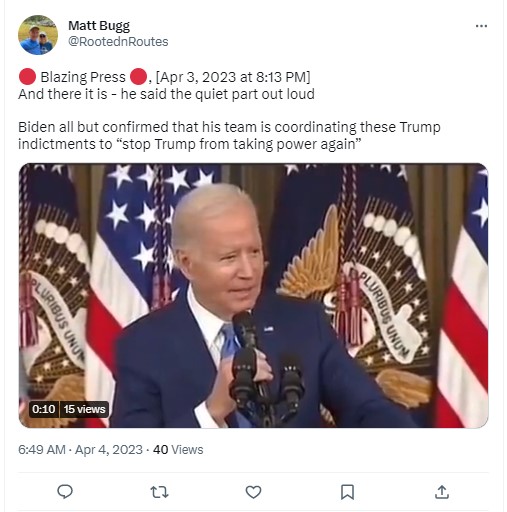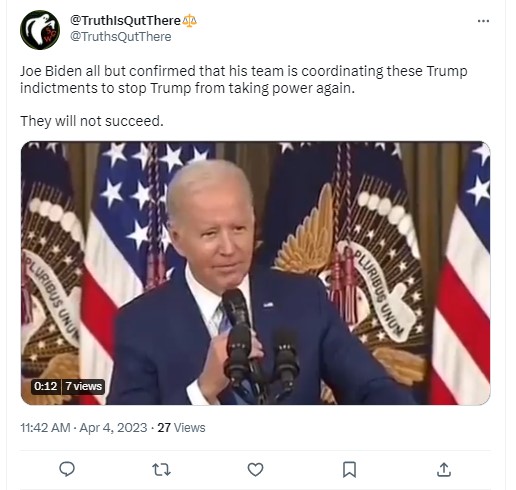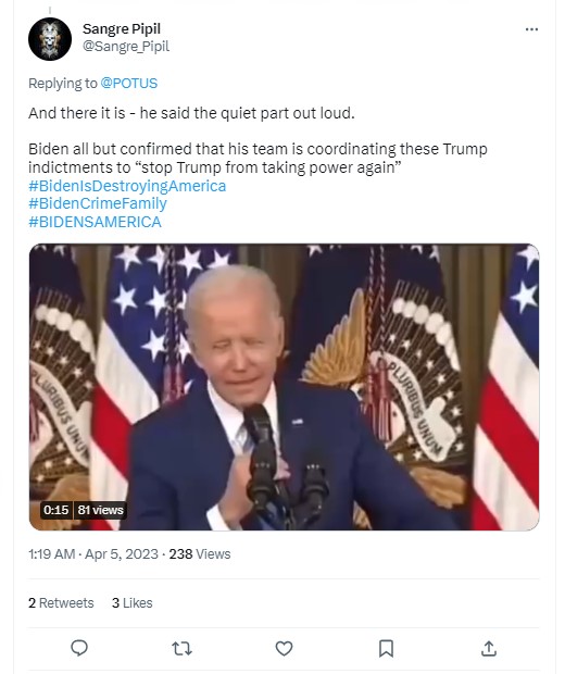 Several social media users shared the video claiming, “Biden all but confirmed that his team is coordinating these Trump indictments to “stop Trump from taking power again” “