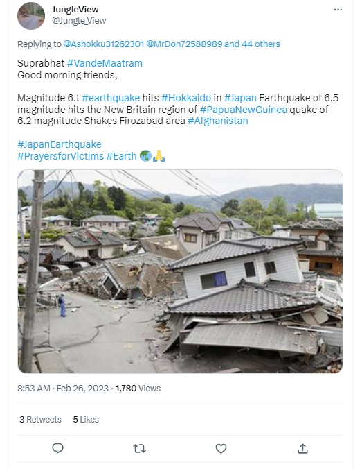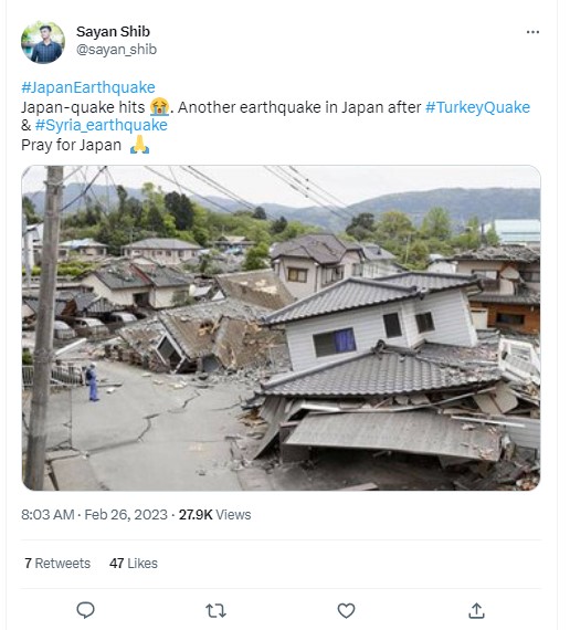 It featured two out of the three clips seen in the viral footage, and elaborated, “A 7.3-magnitude earthquake hit eastern Japan…, cutting power to millions of homes and leading to a tsunami advisory being issued around the Fukushima prefecture…”