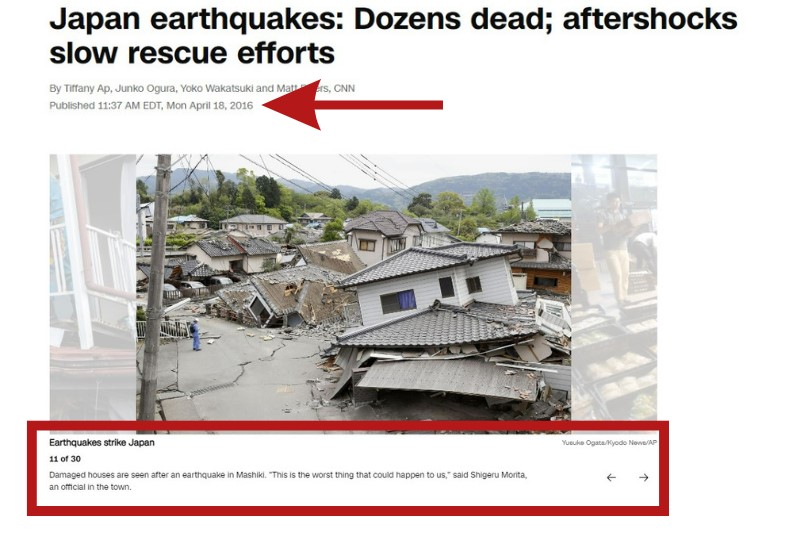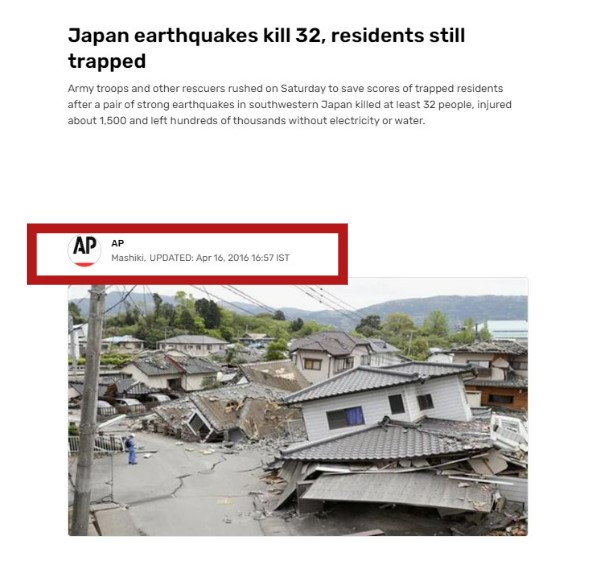 The report featured a series of photographs showing the impact of the quake, including the viral image which was captioned “Damaged houses are seen after an earthquake in Mashiki.”