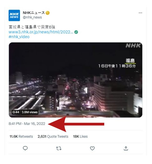 Further, we noticed the logo of NHK News Web, a Japan based outlet, in the last frame of the viral footage, and looked up the keyword “ Fukushima “ in Japanese on its official Twitter handle (@nhk_news). This threw up a tweet dated, March 16, 2022, carrying the viral video with the caption, “Seismic intensity 6 upper in Miyagi and Fukushima prefectures” (translated from Japanese using Google)