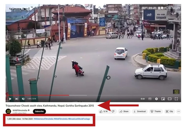 Taking a clue, we looked up keywords “Nepal,” “Tripureshwor,” “Earthquake” & “2015” on YouTube which led us to a video by WildFilmsIndia, dated February 14, 2020.