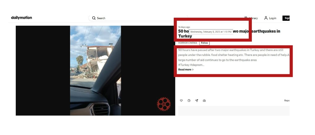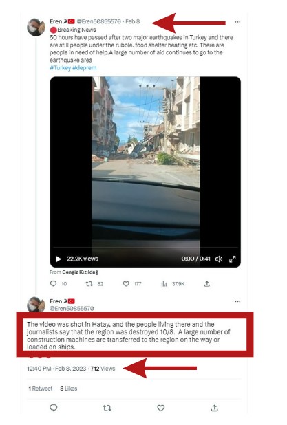 Further, we found that the video was shared with similar captions on YouTube on February 8, 2023. It was also posted on Twitter by @Eren50855570 on the same day, who further pointed out that the video was shot in Hatay.