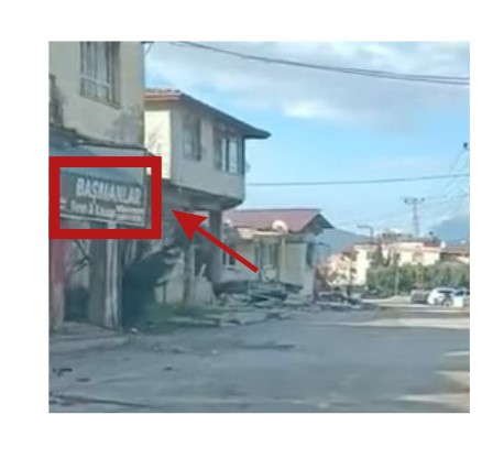 Following this, we looked up “BASMANLAR Hatay” on Google Maps, and were able to locate one of the buildings seen in the viral video at 118 Cumhuriyet Mh. Yolu Antakya, Hatay.